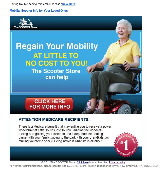 A few years ago I gave a tagged email address to The Home Depot for some warranty paperwork. About a year later, that address made it into the wild. At first I thought it was the big brands as usual selling off email addresses, but then learned through the type of spam I was receiving that it was stolen. I’ve contacted The Home Depot once or twice, but haven’t received one reply. Now today, The SCOOTER Store is spamming that same tagged email address via a marketing agency called Digital Marketing Direct (domain gaigelein.in).